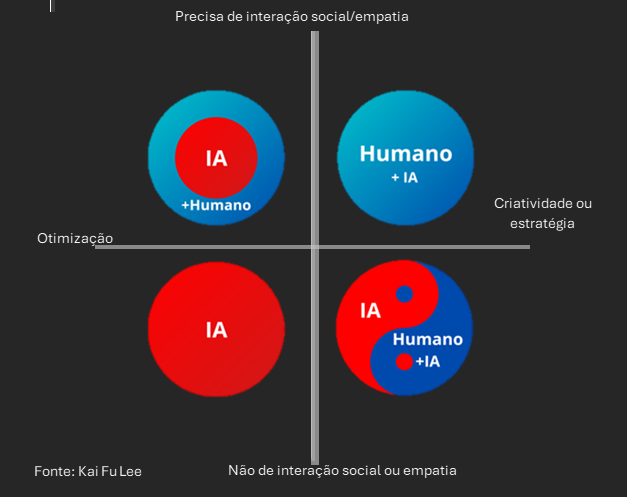 Com base nisso, Lee criou uma matriz que nos ajuda a entender melhor onde a IA pode potencializar os processos e onde a presença humana continua essencial:
